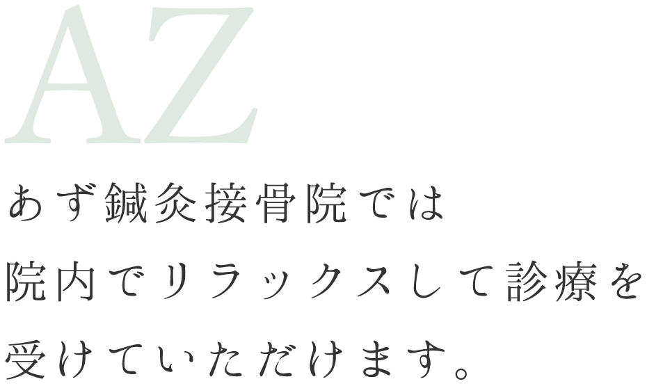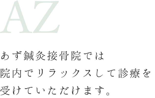 あず鍼灸接骨院は、昭和62年に柴又で開院し、現在は東京、千葉で日々治療に専念しております。 スタッフみんなが親身になって患者様と接するよう努力しております。 明るく清潔感のある院内で、とてもリラックスして診療を受けていただけます。 カウンセリングにもしっかりと時間をかけ、様々な相談にも対応しております。 また、メールでのお問い合せも受け付けています。 お悩み・ご質問がございましたら、ぜひご連絡ください。